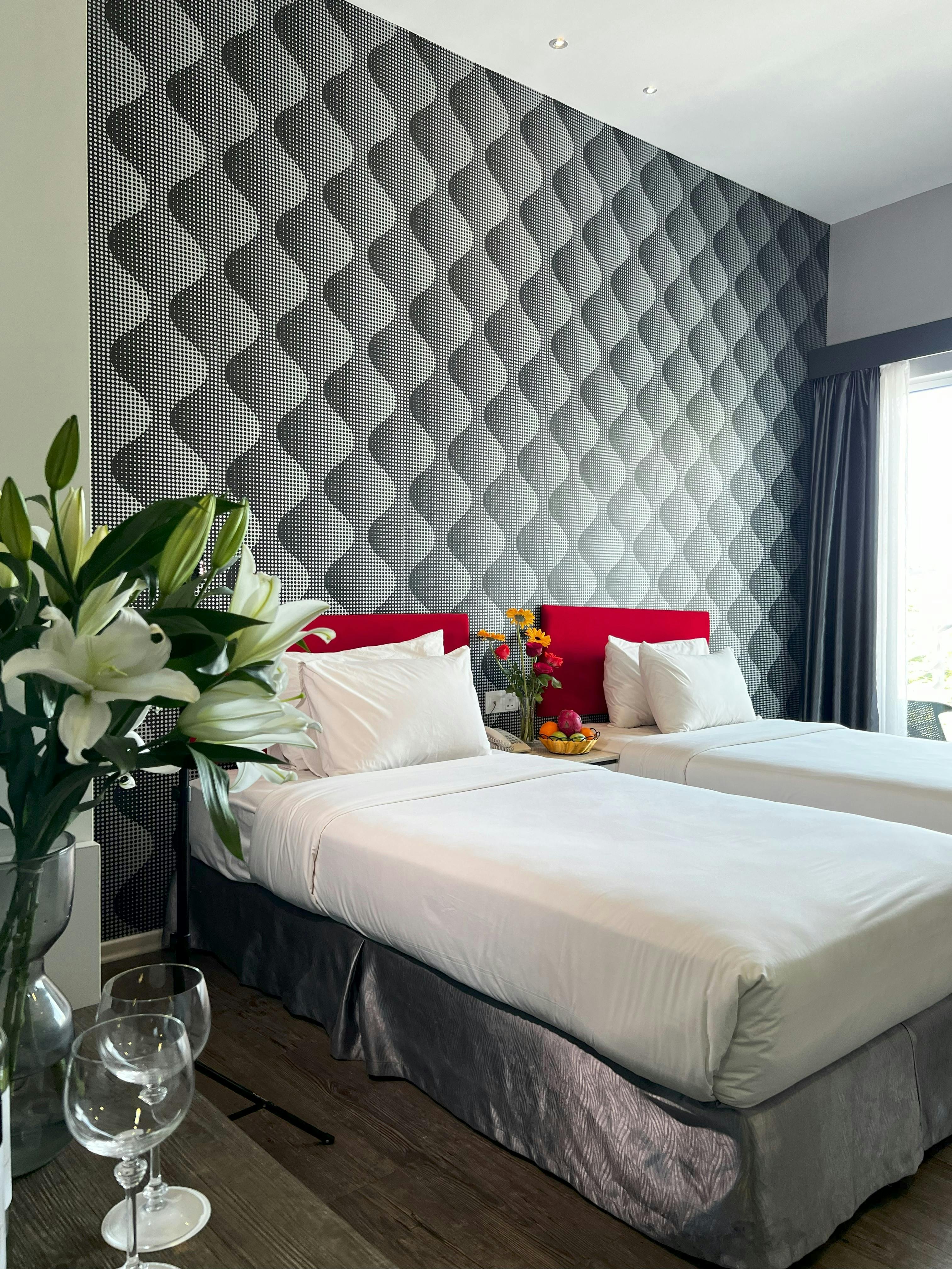 This charming 22-square-meter room features two single beds with beautiful headboards, soft duvets, high-quality cotton sheets, and plush polyester pillows. A private balcony offers stunning city views, perfect for soaking in the Cenang Beach vibes. The air-conditioned Deluxe Twin Room includes two single beds and offers pleasant street views. It also features a flat-screen satellite TV, an electric kettle, a mini fridge and a convenient desk. The private bathroom comes equipped with shower facilities, a hairdryer, and complimentary toiletries.